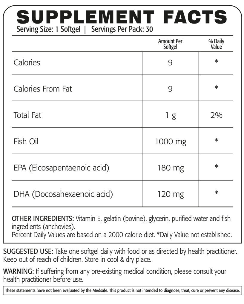 Vitaleno Omega 3 Fish Oil (Softgel) Omega 3 Fish Oil 1000 mg with EPA 180 mg DHA 120 mg Vitaleno Omega 3 fish oil contains 1000 mg of fish oil a best pathway to optimal health. The omega-3 fatty acids found in fish oil are essential elements of a healthy diet which you can fulfill by taking supplements.